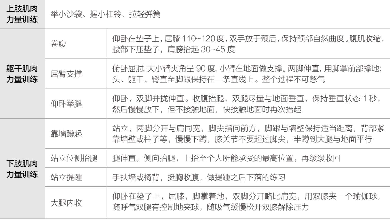 目前,预防、治疗老年人肌肉萎缩、力量下降的方法是肌肉力量训练,训练时以腿部、手臂、胸部、背部、腹部为主。先练大肌肉群,后练小肌肉群,大关节活动优先于小关节活动,多关节动作练习优先于单关节动作练习,因为大肌肉群、大关节的运动对心肺功能影响较大。