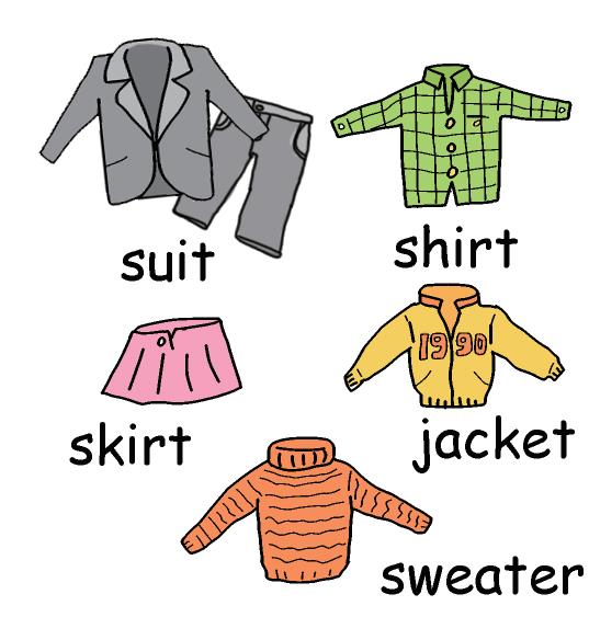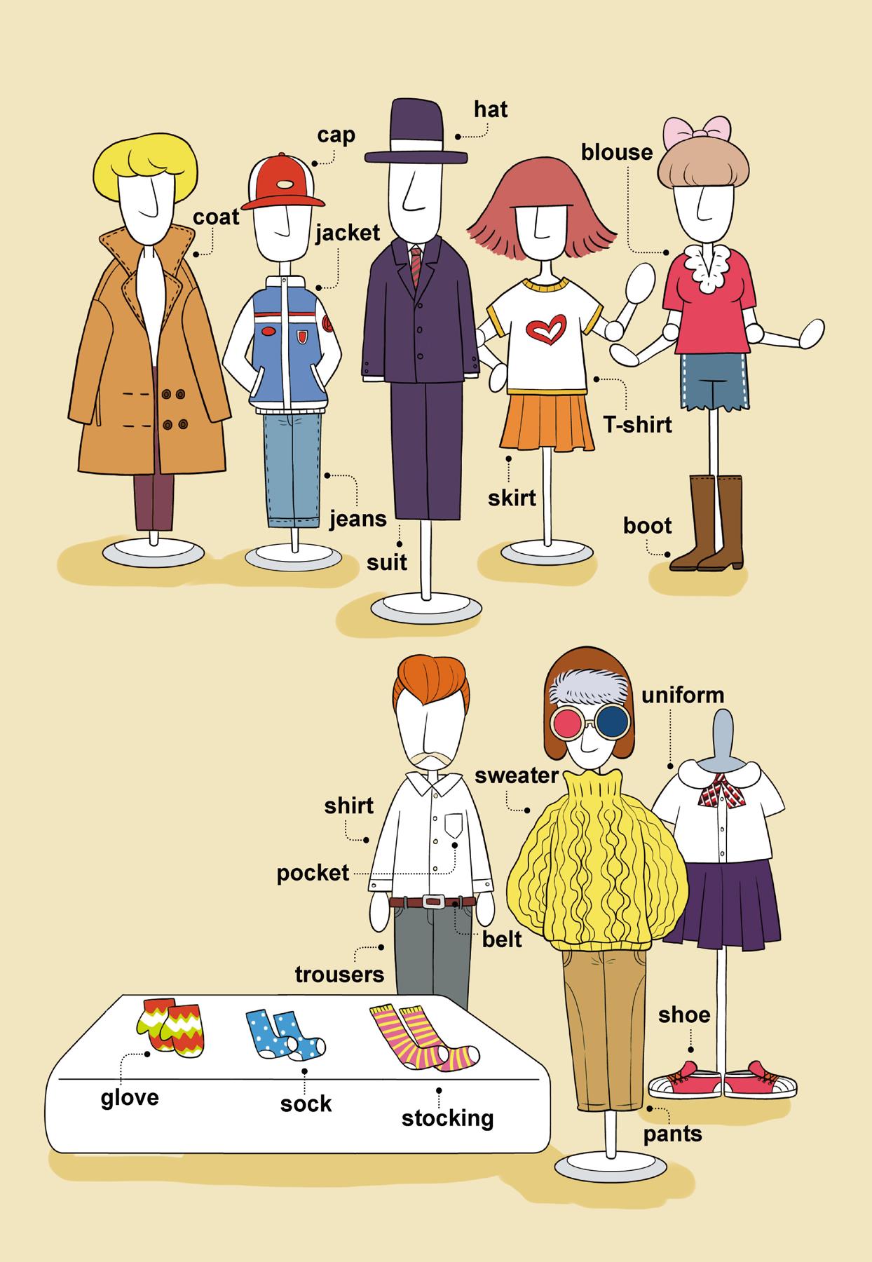 串联 衣着: coat* 外套 suit 西装 skirt 短裙 shirt 衬衫 T-shirt T恤衫 sweater 毛衣 jacket 夹克 blouse 女装上衣 jeans 牛仔裤 trousers* 裤子 pants 裤子 uniform 制服 pocket 口袋 shoe 鞋子 sock 短袜 stocking 长筒袜