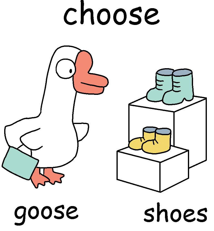 记 音律记忆: 一只goose(鹅),choose(挑选)shoes(鞋子)