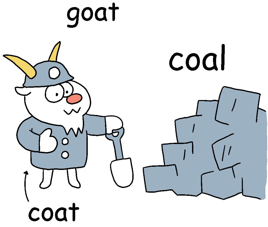记 联想记忆: 一只goat (山羊),穿着coat(外套),去挖coal(煤炭)