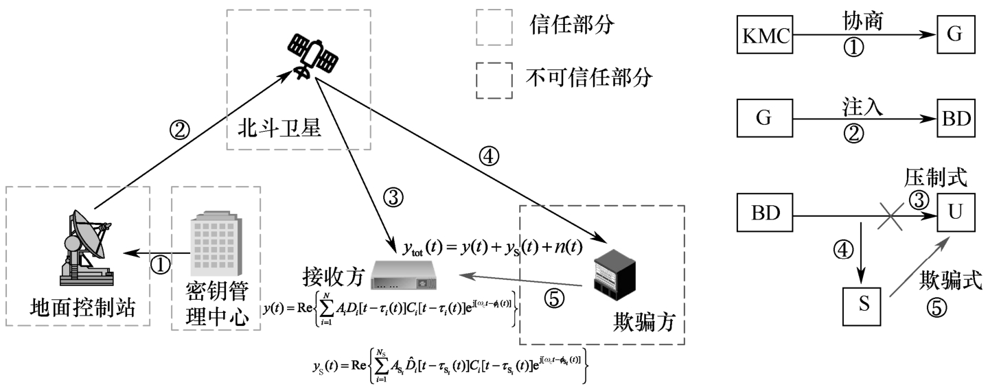 图3-1中,每个通信过程都被赋予了标号,细虚线框代表模型中的信任部分,粗虚线框代表模型中的不可信任部分,KMC代表密钥管理中心,G代表地面控制站,BD代表北斗卫星,U代表接收方,S代表欺骗方。该模型设计的前提假设是在密钥管理中心(Key Management Center,KMC)与地面控制站协商密钥及安全参数的过程中,地面控制站将导航电文注入卫星的过程是信任部分,而欺骗方篡改真实卫星信息的过程是不可信任部分。欺骗攻击模型和过程描述如下。