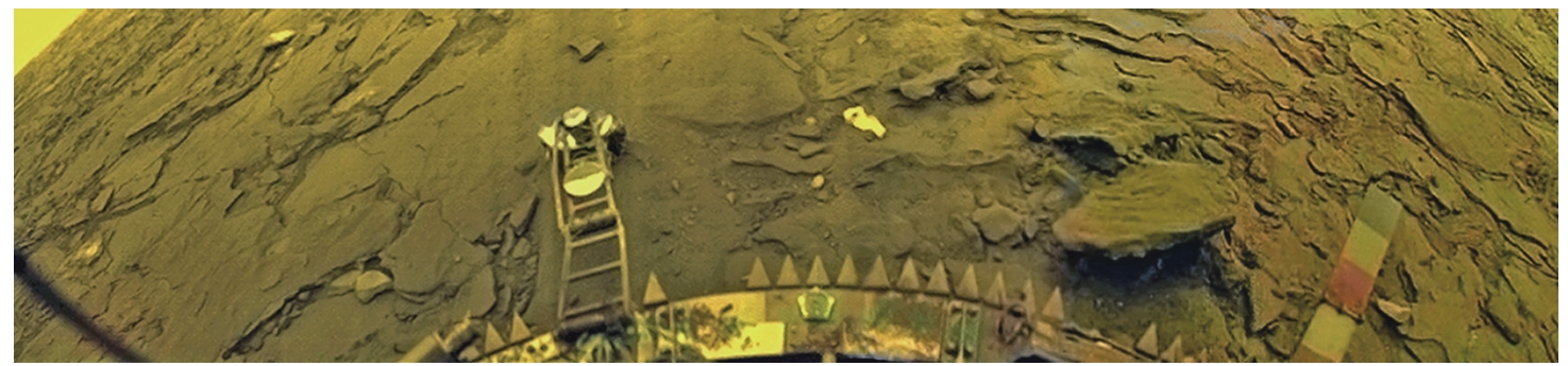 ●苏联的金星14号探测器在穿过金星大气着陆后拍摄到的金星表面照片。这台探测器在金星表面恶劣的环境中仅“存活”了两个小时就宣布失灵,但在这两个小时里它仍获得了金星表面的大量宝贵数据。