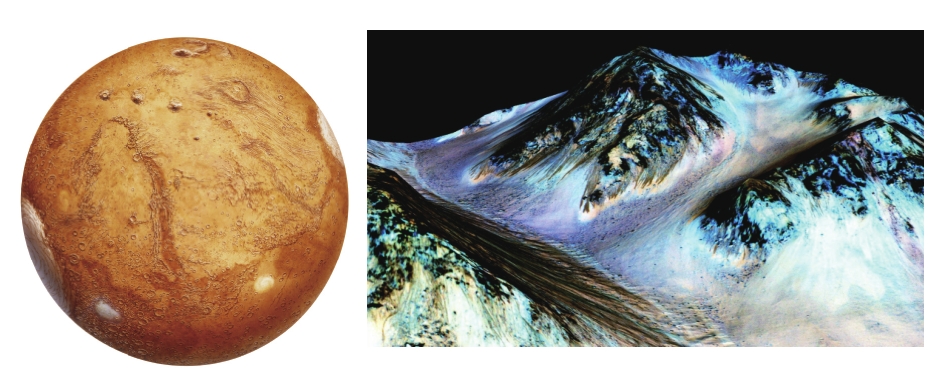 ●(左图)火星和火星表面最显著的特征是“水手峡谷”,即在火星赤道附近从西侧一直延伸到东侧的大裂谷。“水手峡谷”周围有丰富且复杂的河道系统。(右图)火星表面山坡上疑似有水流冲刷形成的痕迹(延伸向下的黑色线条)。