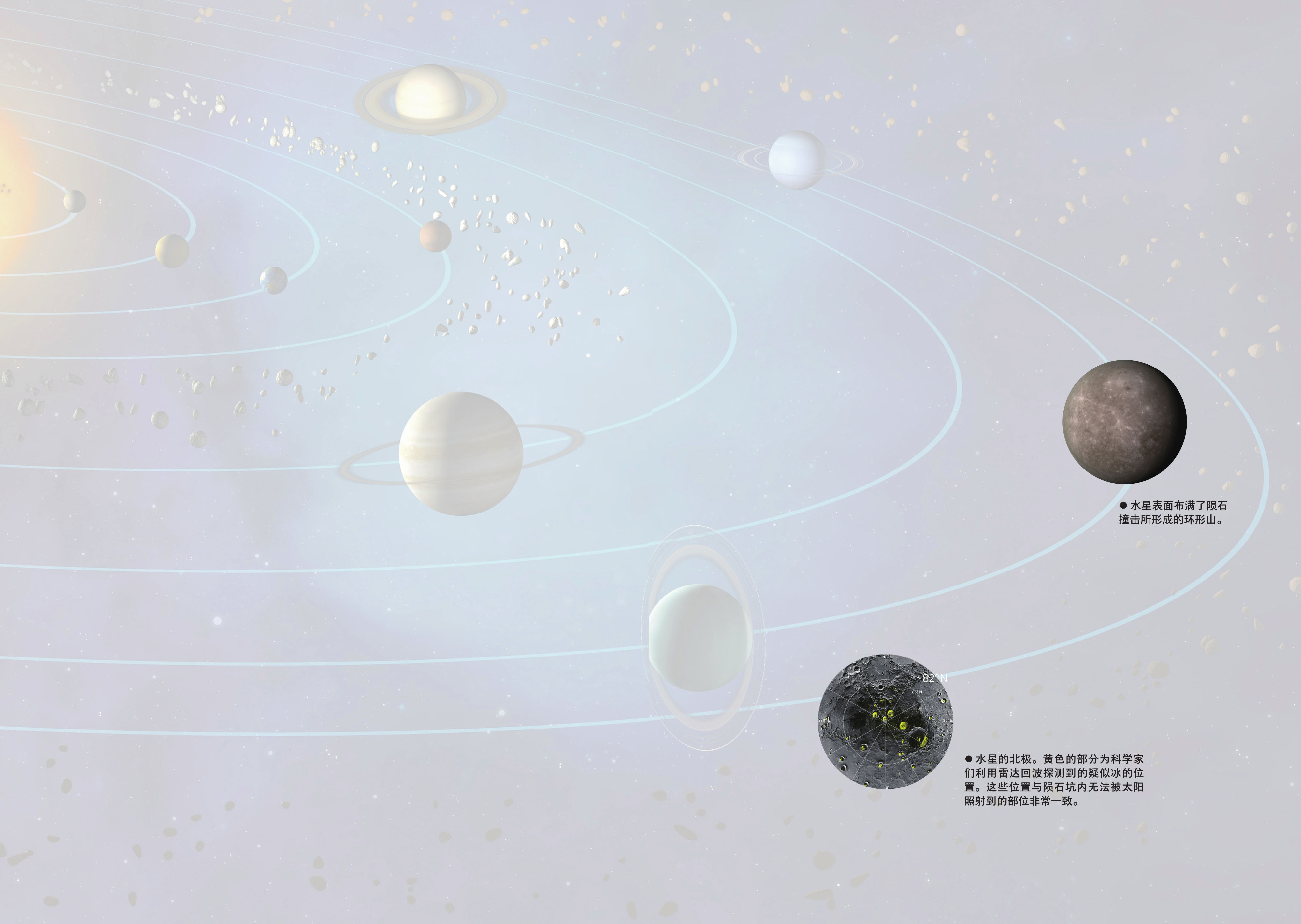 在水星的北极,那深深的陨石坑底终日不见阳光,科学家们认为那里极有可能存在着固态水——冰。