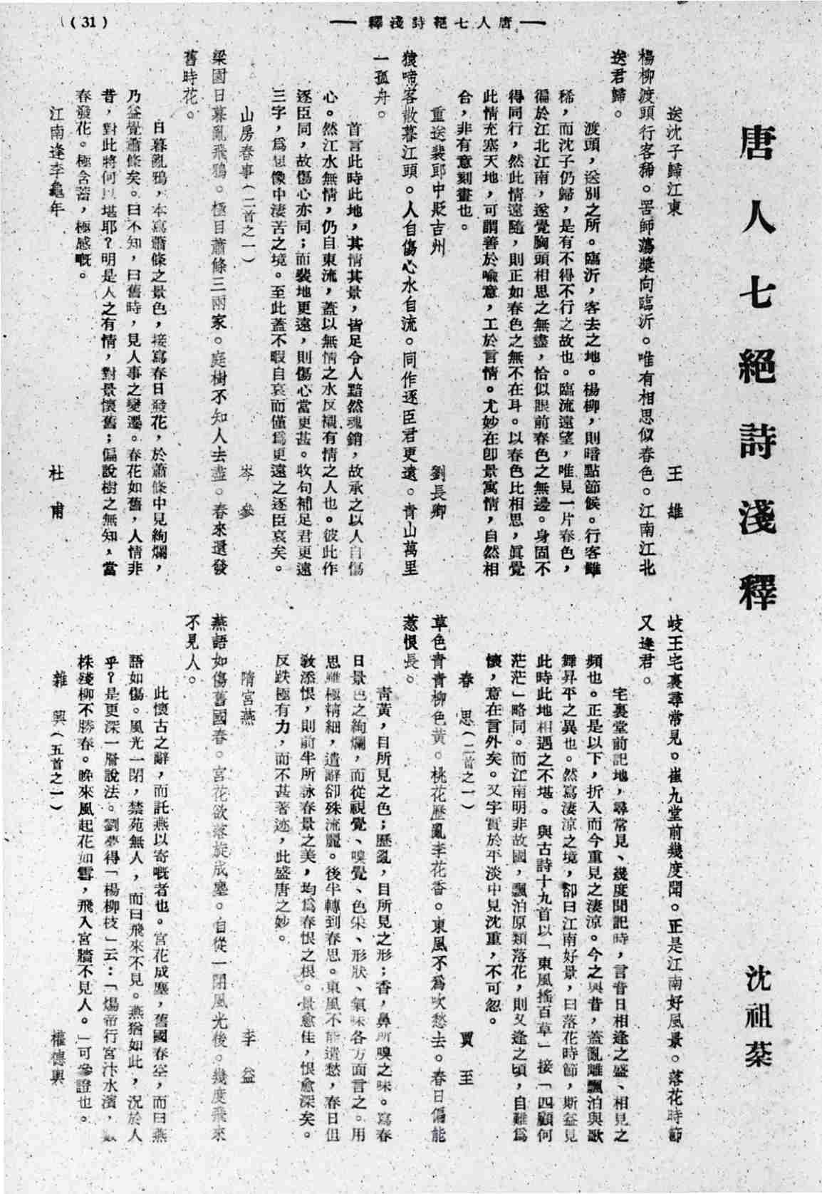 1948年《国文月刊》刊出《唐人七绝诗浅释》