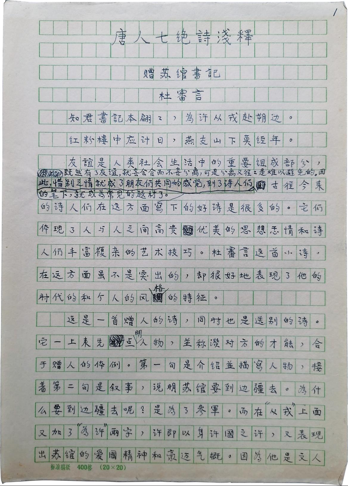 稿纸本《唐人七绝诗浅释》首页