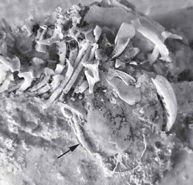 其中有胚胎和绳状脐带的碎片(由箭头标识)。