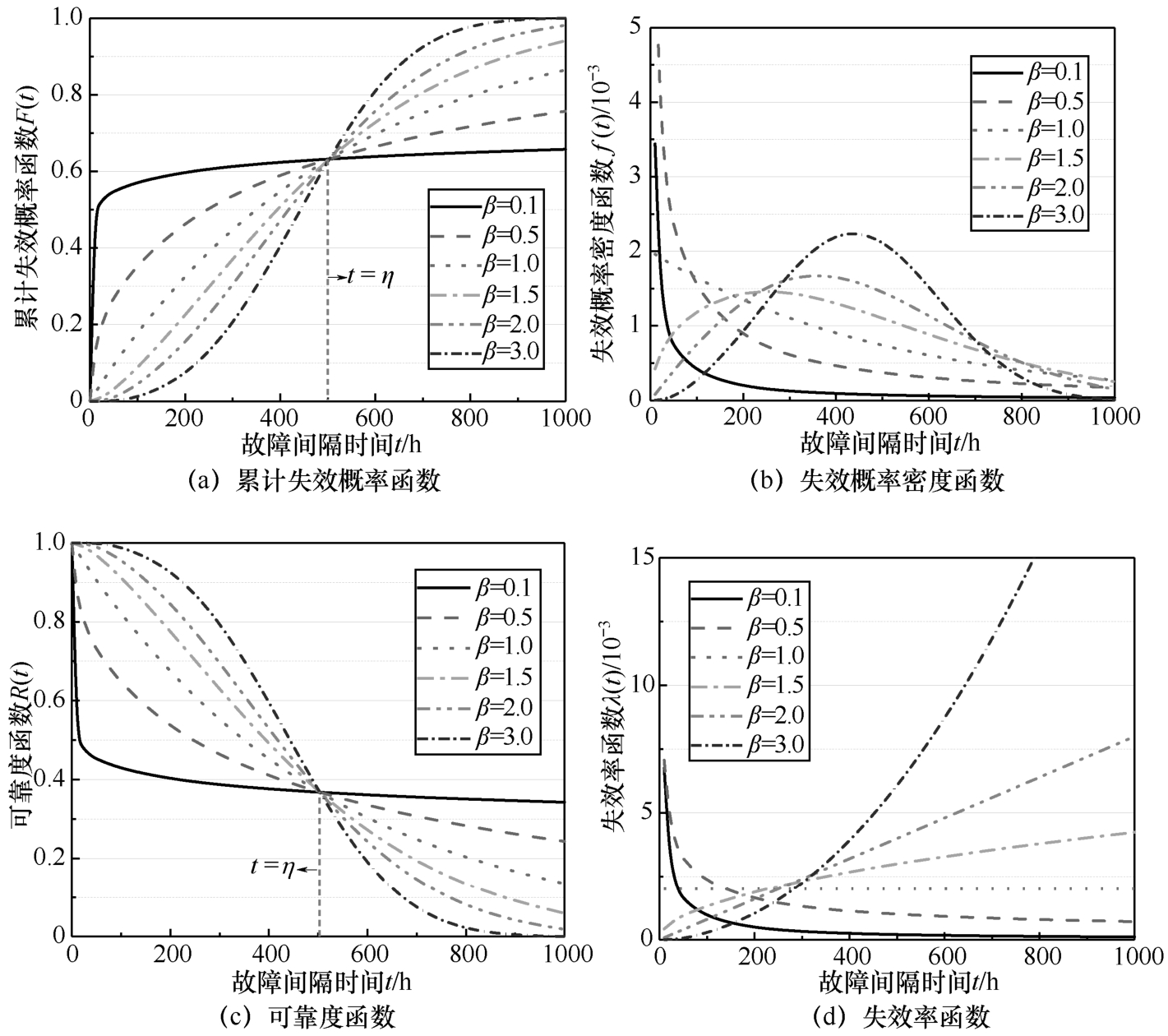 韦布尔(Weibull)分布模型对浴盆曲线反应较为灵敏。在工程应用中,两参数韦布尔分布是最基本的形式,设 T ~ W ( β , η ),则其可靠性评价函数分别表示为