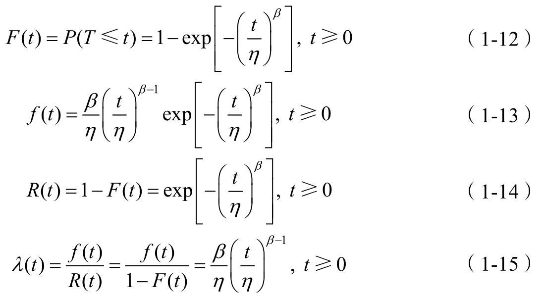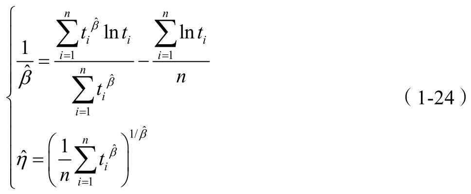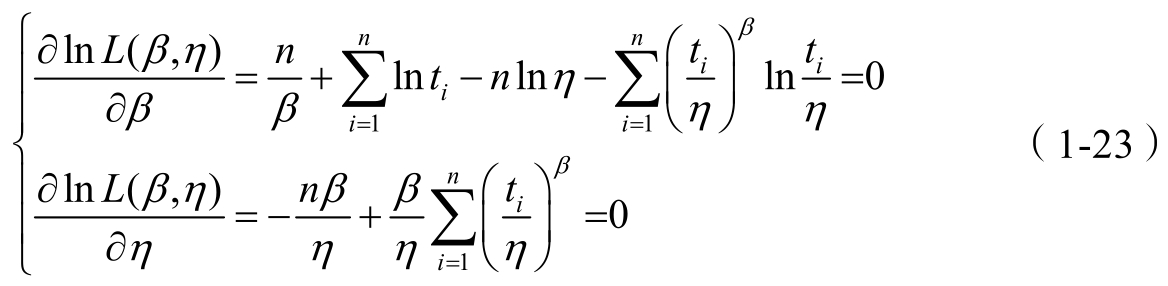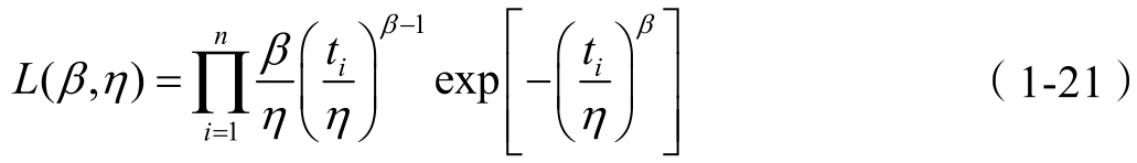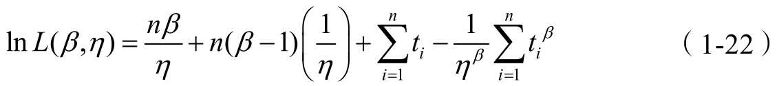 对于包含参数 β 、 η 的韦布尔分布,将式(1-13)代入式(1-20),建立极大似然函数:
