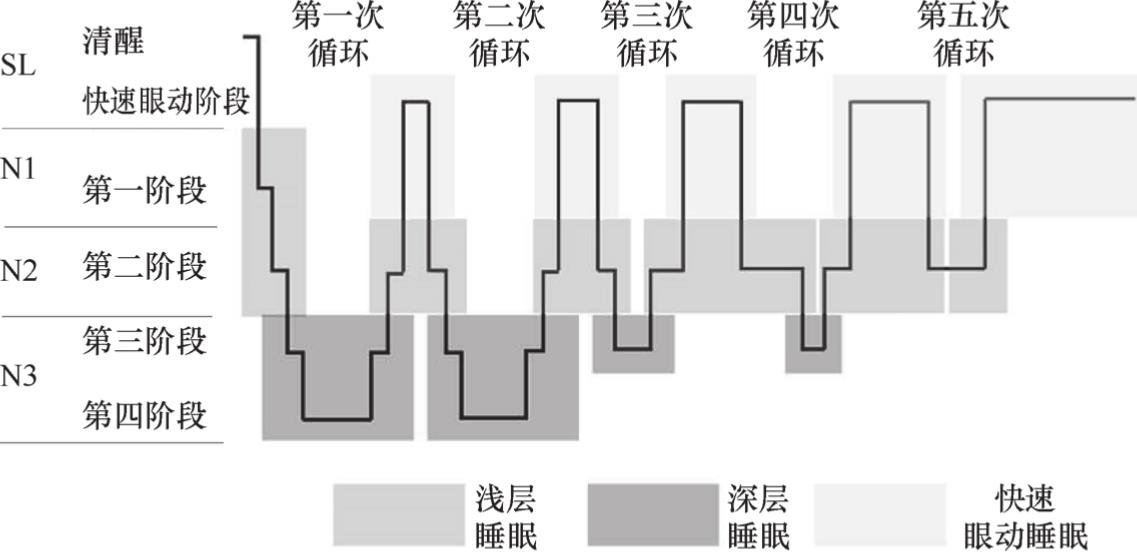 ,并对每个阶段的脑电波进行了命名。他们还发现睡眠的五个阶段并非完全按顺序切换的,阶段切换有可能是内源性刺激的结果(见图1-8)。这首次揭示了睡眠不是简单的全身休息,而是有很多脑部活动的特殊状态。