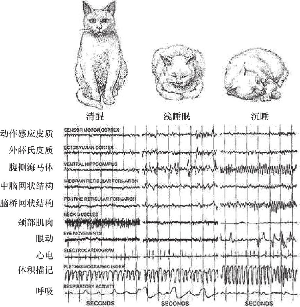 迪门特在1958年先发表了第一项研究的论文,表明实验动物在快速眼动睡眠期间大脑也处于高度活跃状态。该论文比较了实验动物在清醒、浅睡眠、沉睡三个不同状态下的脑电图,发现实验动物的大脑在快速眼动睡眠时再次被激活(见图1-9)。证明动物和人类的睡眠模式完全一样,之后迪门特还通过早产儿发现婴儿在子宫里就有快速眼动睡眠了。