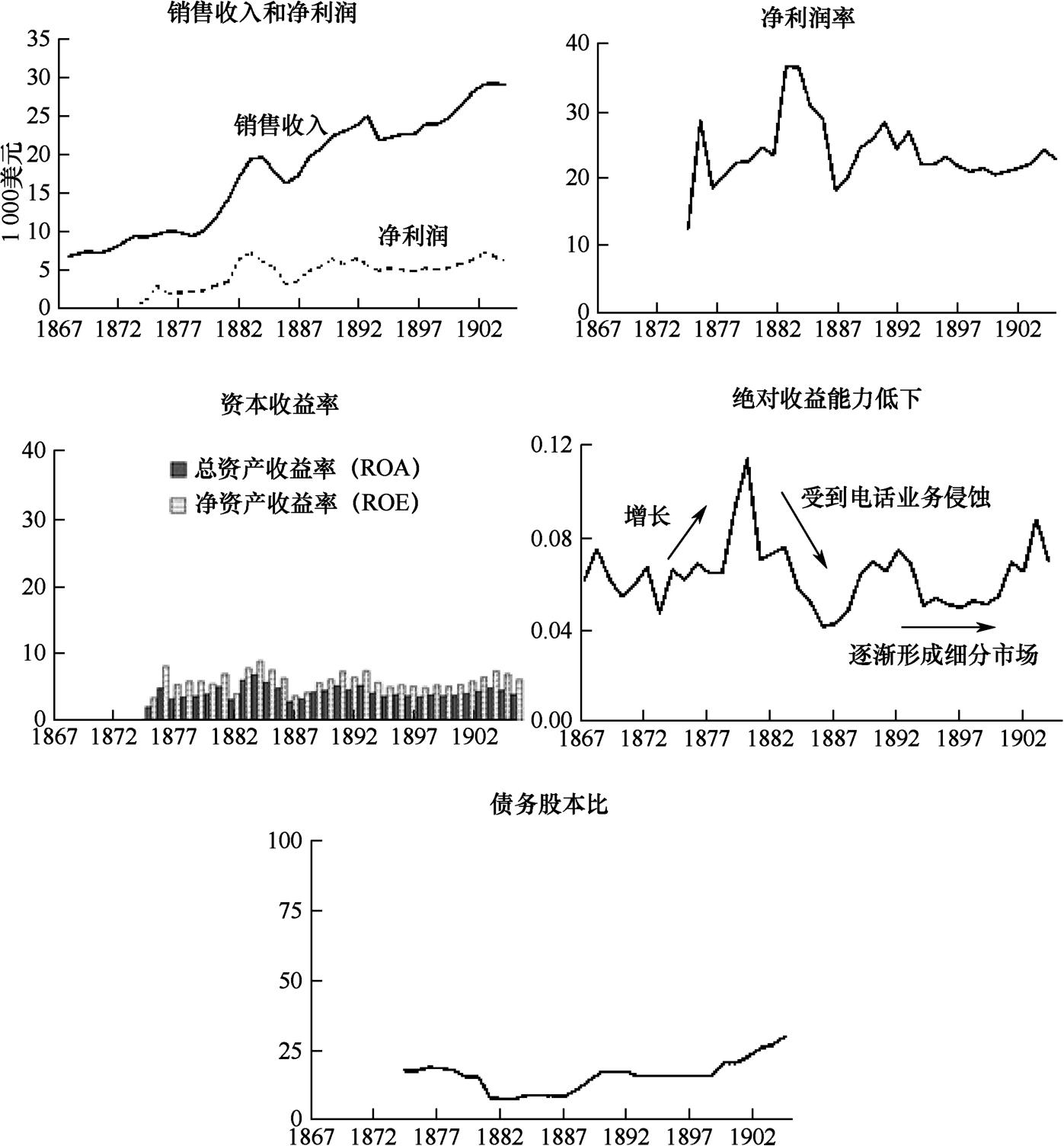 西联汇款在电报市场上的统治地位在其财务报表上表现得淋漓尽致。在19世纪60年代初期,公司的营业利润率保持在35%~40%范围内,销售收入的年均复合增长率为10%。尽管需求相对缺乏弹性,但销售收入对基础经济形势非常敏感。在经济颓势时期,收入增长会相对放缓,但不会大幅下降。在19世纪60年代后期的经济衰退和股市崩盘期间,杰伊·库克银行等诸多金融公司以及包括北太平洋铁路公司在内的很多铁路公司纷纷倒闭。而西联汇款始终维持营业利润和净利润为正数,净利润的降幅约为10%。