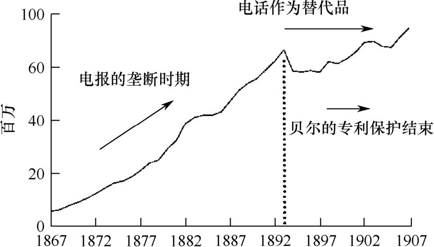 通过对西联汇款的攻击,最终让古尔德在公司内赢得一个有足够影响力的职位。因此,一个意料之中的结果,就是西联汇款很快发现,他们开始遭遇其他对手的围攻。先锋就是巴尔的摩—俄亥俄电报公司(Baltimore and Ohio Telegraph Company),他们直接挑起价格战,并把战火一直延续到1887年被西联汇款收购为止。1880年,西联汇款占据了全美电报业务量的80%,但是在收购巴尔的摩—俄亥俄电报公司之后,西联汇款这个庞大的联合体实际上已成为美国电报业的代名词。董事会是公司权力与影响力的集中显示,而古尔德和范德比尔特的代言人是他们各自提名的董事——代表联合太平洋的是托马斯·埃克特,而中央太平洋公司的代表则是需要浓墨重彩般推出的金融家J.P.摩根。西联汇款以铁路行业无法做到、甚至无法想到的方式主宰了整个行业(见图3-2)。可以说,在某种程度上,电话是为了对抗美国最强大的公司寡头而出现的。