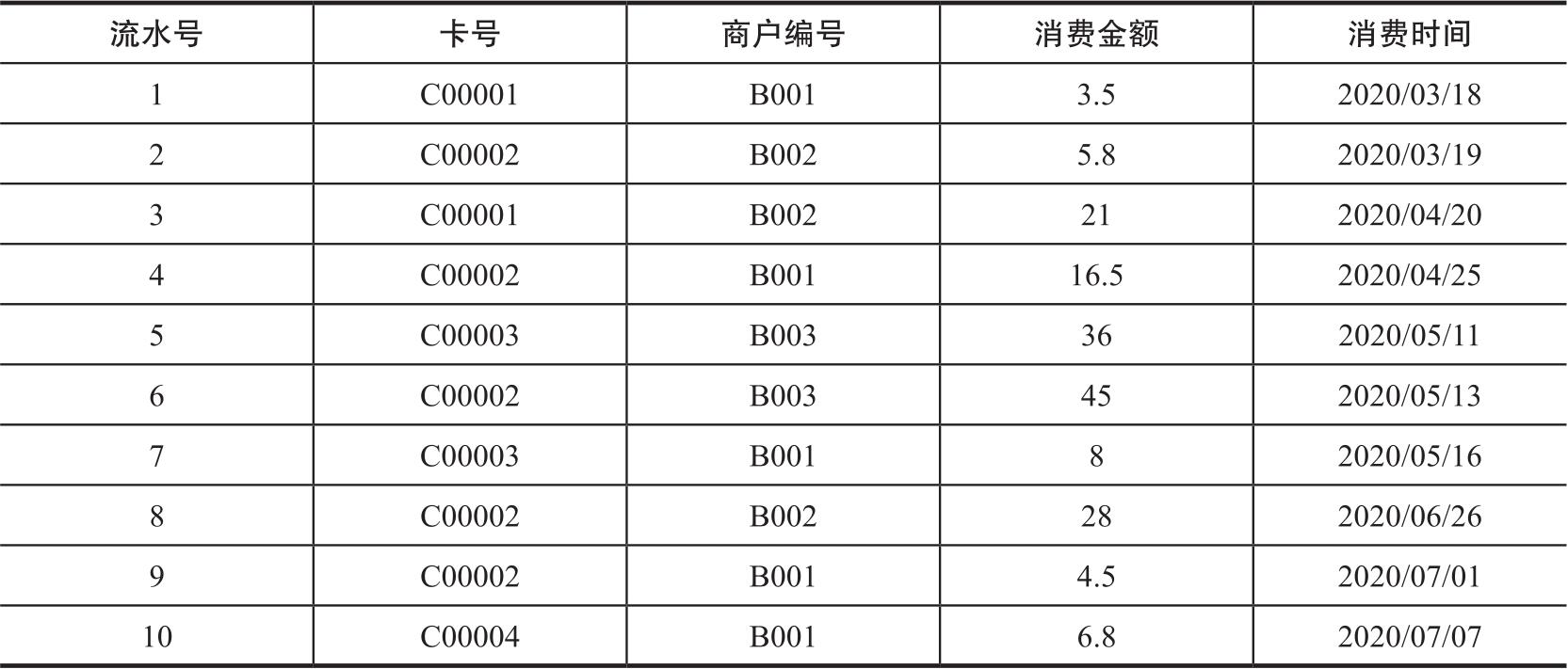 关系数据模型用二维表格作为数据结构,表示实体及实体之间的联系,并把二维表格命名为关系。例如,校园卡和商户之间的多对多联系可以表示为如表1-3所示的关系,关系名为“消费清单”,包含五个属性(列),分别是流水号、卡号、商户编号、消费金额、消费时间;属性的数据类型和长度依次是auto_increment、CHAR (6)、CHAR (4)、DECIMAL(10, 2)和DATE;记录了10笔消费。关系建立后先记录了第一笔消费,即关系的第一行表示C00001校园卡在B001商户进行了一笔消费;接着记录第二笔消费,即第二行表示C00002校园卡在B002商户进行了一笔消费;第三行表示C00001校园卡在B002商户进行了一笔消费。此时不难发现,C00001校园卡在B001、B002商户都有过消费记录,即一个校园卡与多个商户发生联系。我们插入第四行,表示C00002校园卡在B001商户进行了一笔消费,这时一个商户对应多张校园卡的联系也表示出来了。可见,关系数据模型用简单的线性数据结构表示了校园卡与商户之间多对多的联系。