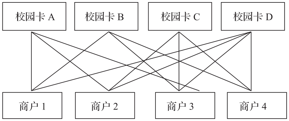 网状数据模型是基于网状数据结构的一种逻辑数据模型。在网状数据模型中,允许有一个以上的无双亲结点,也允许一个结点可以有多于一个的双亲结点。这种多对多的联系破坏了双亲结点与子女结点之间的层次关系,因此在网状数据模型中需要为每个联系命名,并需要指出与该联系有关的结点。例如,学生持校园卡在商户消费,一张卡可以在多个商户消费,一个商户可以接受不同的校园卡,校园卡和商户之间是多对多的联系,该数据模型的网状数据模型示例如图1-32所示。