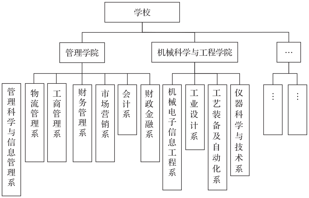 层次数据模型是用树结构定义实体及实体之间的联系的,是最早商业化应用的数据模型。层次数据模型中的结点代表数据,结点之间的连线代表不同数据之间的联系。顶层的结点只有后继,没有直接前驱,称其为根结点。除根结点以外的各结点有且只有一个唯一的位于其上一层的直接前驱,称其为双亲结点,可以有零个、一个或多个位于其下一层的直接后继,称其为子女结点。最下层的结点只有双亲结点,没有子女结点。例如,学校的院系设置中,一个学校有多个学院,一个学院有多个系,同时每个学院都只隶属于该学校,每个系也只隶属于一个学院,即学校与学院之间是一对多的联系,学院和系之间也是一对多的联系。其层次数据模型示例如图1-31所示。
