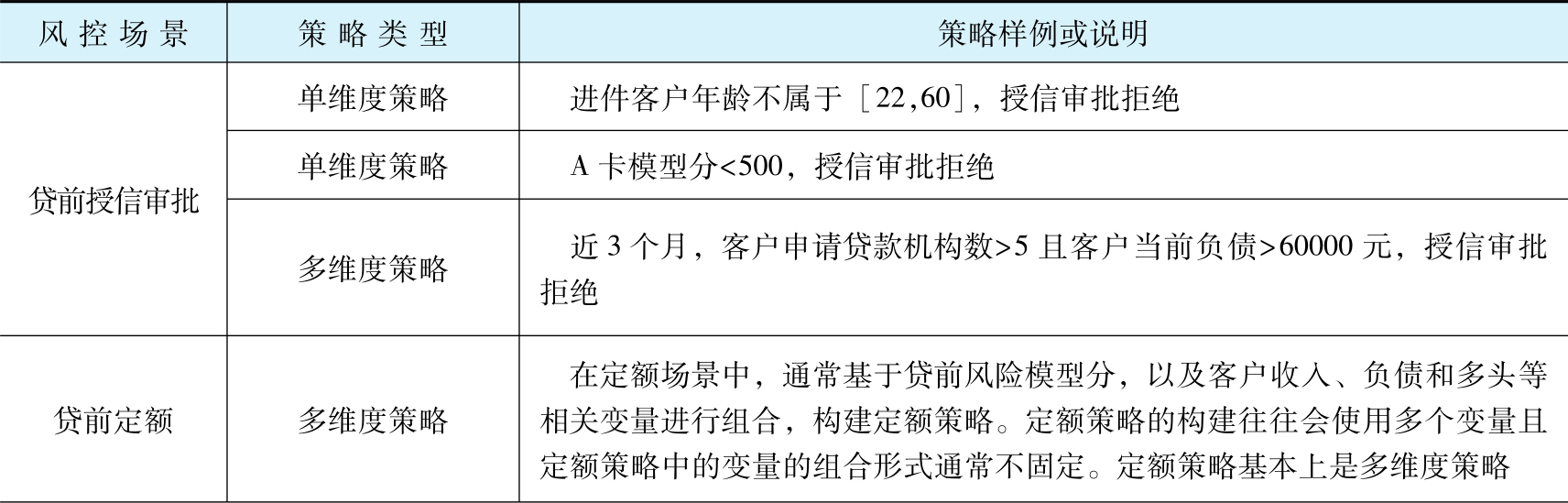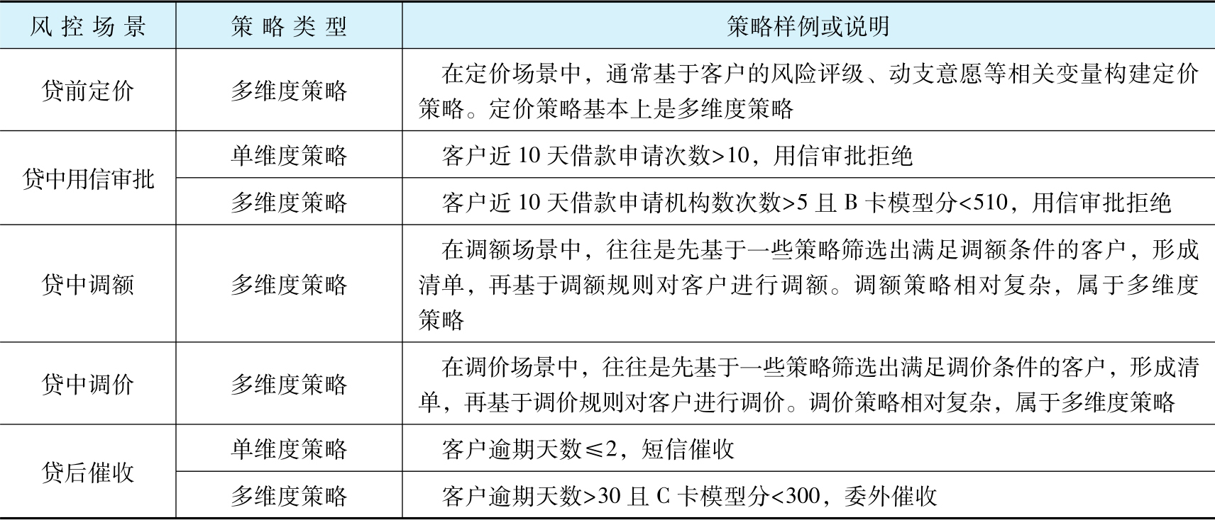 表2-1展示了贷前、贷中、贷后的一些风控场景涉及的策略类型及其对应的策略样例,这些样例可以方便读者更好地了解单维度策略和多维度策略。