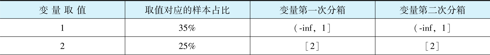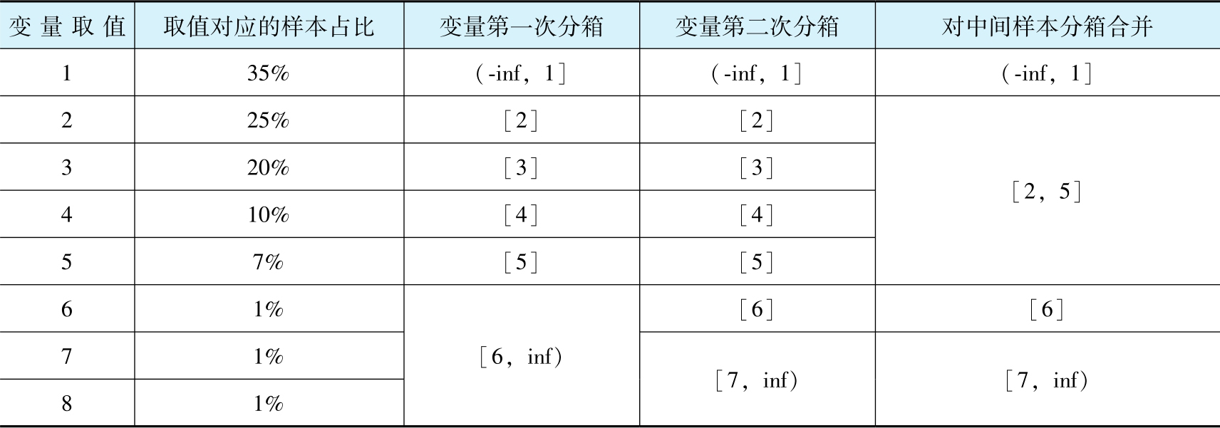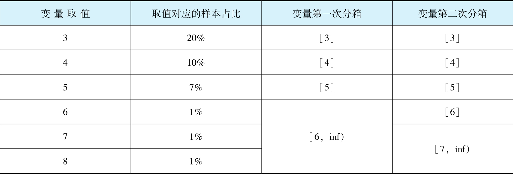 基于表2-3,首先要对变量进行第一次分箱,将头部和尾部的5%的样本归入一箱。头部样本取值为1时,样本占比为35%,已经超过5%,故无须进行样本切分,尾部的最后4个样本取值分别为8、7、6、5,对应的样本占比分别为1%、1%、1%、7%,若对8、7、6进行合并,则样本占比为3%,小于5%,若对8、7、6、5进行合并,则样本占比为10%,大于5%,不满足分箱条件,分箱终止,故只需要对8、7、6对应的分箱进行合并。变量第一次分箱结果见表2-4中“变量第一次分箱”列。