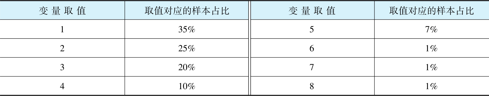 表2-3为虚构的数据样例,表中变量非缺失值取值个数为8,对变量值从小到大排序,并计算各个取值对应的样本占比。