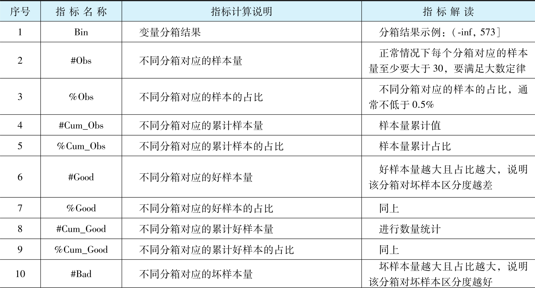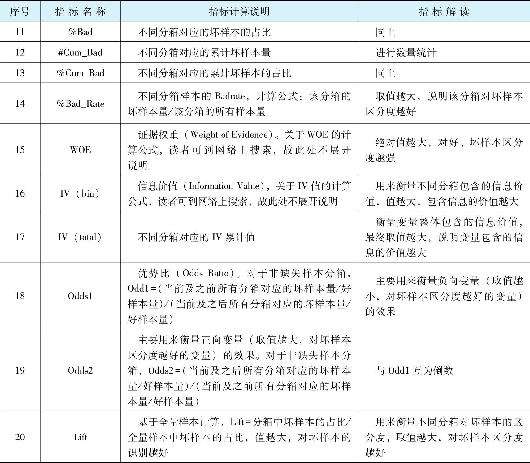 结合目标字段和分箱结果计算的主要指标见表2-6。2.2.7节中的案例实践代码部分计算的指标的名称和表2-6中“指标名称”列是一一对应的。