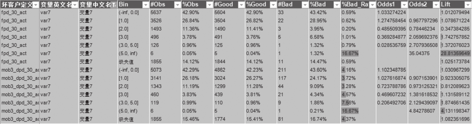 图2-3是变量最终分箱结果示例图,在变量分箱过程中,虽然计算了数十个统计指标,但是比较重要的6个统计指标分别为Bin、#Obs、%Obs、#Bad、%Bad_Rate、Lift,因为基于上述6个重要的统计指标基本上就能够确定变量头部或尾部的分箱对坏样本的区分度了。