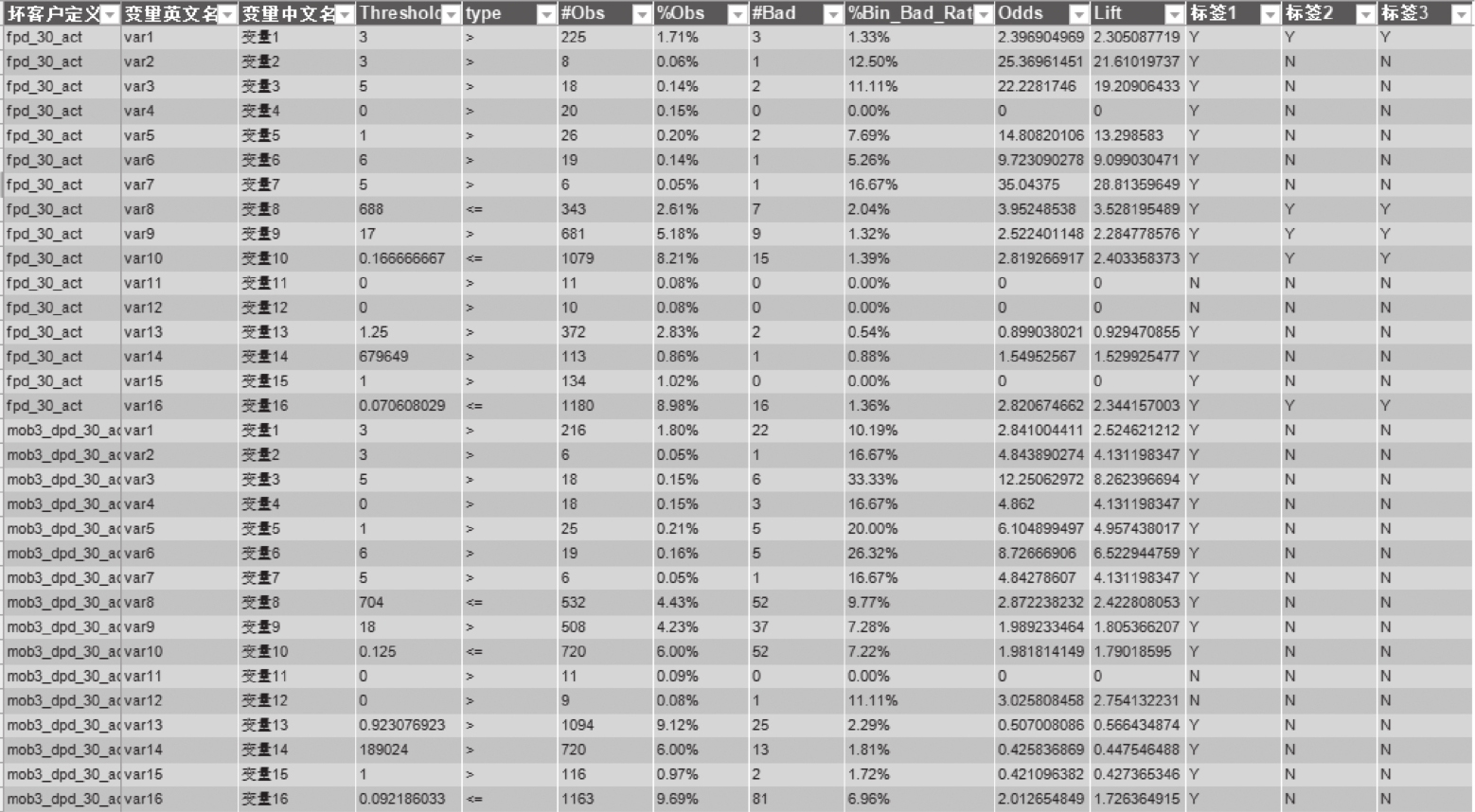 图2-4是策略测算效果分析和筛选的结果示例,标签1为Y表示变量描述性统计分析筛选通过,标签2为Y表示规则效果分析筛选通过,标签3为Y表示基于规则变量的相关性分析最终筛选出来的需要进行泛化的规则,在最终筛选规则进行泛化的时候,筛选的是标签1、标签2和标签3同时为Y的规则。