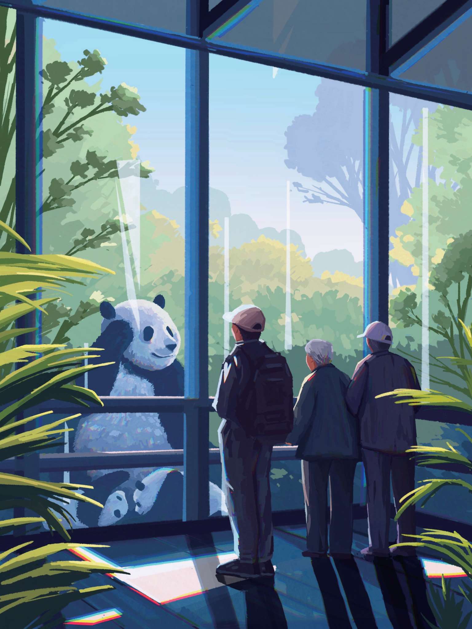 有一只大熊猫看到了站在玻璃窗外的我们,
