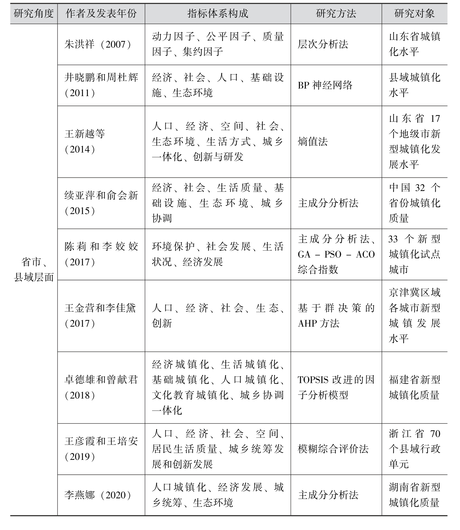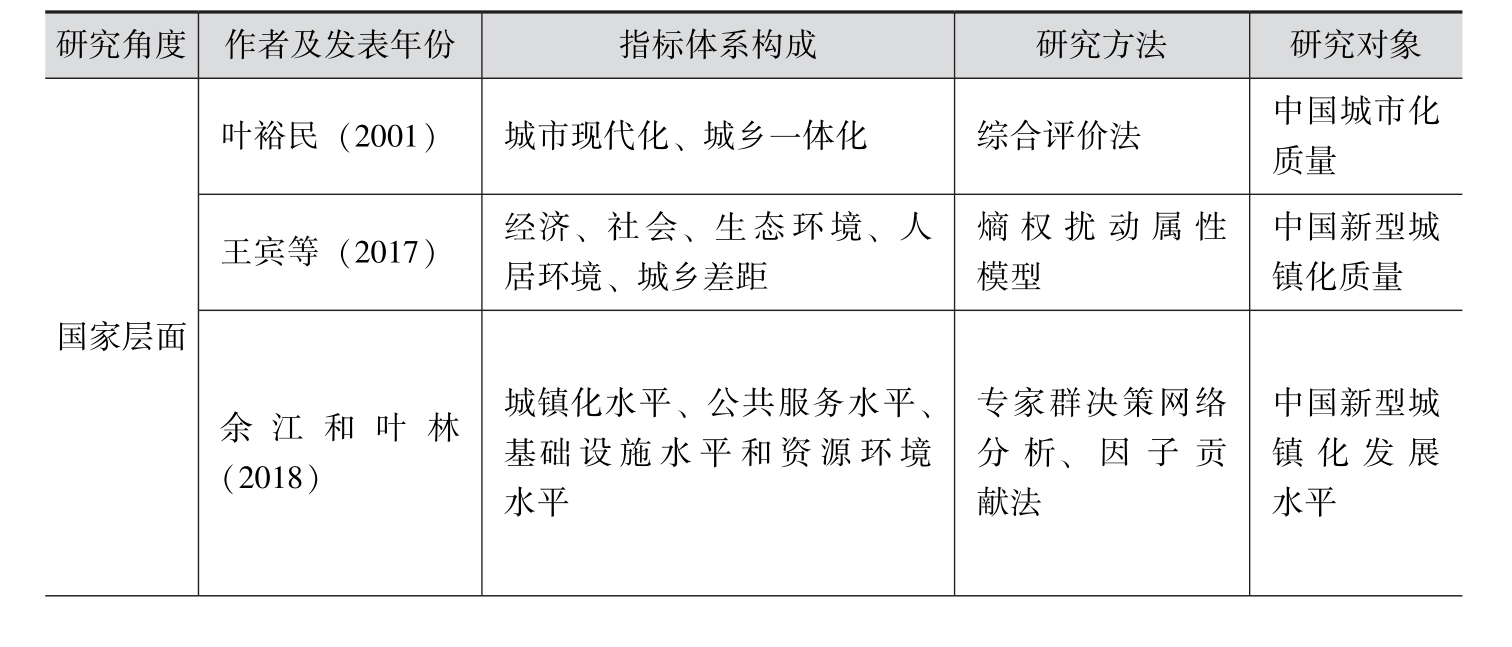 针对城镇化质量评价指标体系的构建,国内学者从不同层面(国家、省级、城市级、县域级层面等)采用不同研究方法展开了大量研究。如表1-1所示,叶裕民(2001)、王宾等(2017)、余江和叶林(2018)构建评价指标体系,对中国新型城镇化质量进行了评价。朱洪祥(2007)、井晓鹏和周杜辉(2011)、王新越等(2014)、王金营和李佳黛(2017)等通过构建评价指标体系,对区域层面的新型城镇化水平进行了评价。进行相关研究的还有续亚萍和俞会新(2015)、陈莉和李姣姣(2017)、卓德雄和曾献君(2018)、王彦霞和王培安(2019)、李燕娜(2020)等。虽然这些研究关注的焦点存在差异,但都涉及城镇化质量的核心问题,其研究选取的指标涉及经济、社会、环境、城乡等因素。