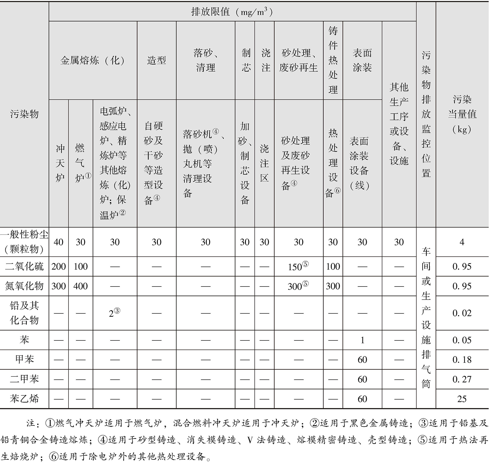 表2-2 铸造工业应税污染物排放限值及污染当量值