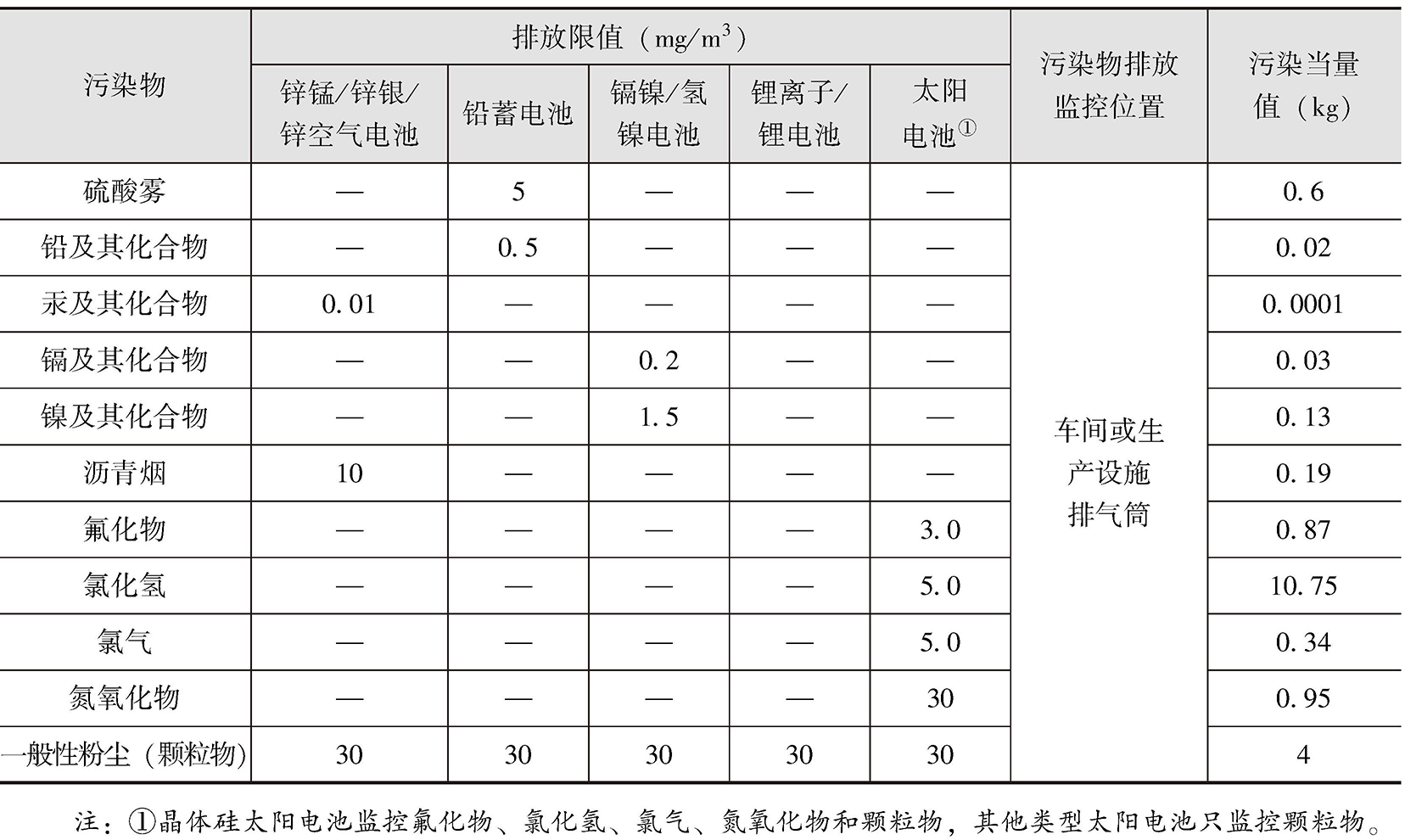《电池工业污染物排放标准》(GB 30484—2013)规定了电池工业污染物净化设施排放口的12种污染物监测项目,其中一般性粉尘(颗粒物)、氮氧化物、沥青烟、氯化氢、氯气、硫酸雾、氟化物、铅及其化合物、镉及其化合物、镍及其化合物、汞及其化合物为《中华人民共和国环境保护税法》中规定的应税污染物,其排放限值及污染当量值见表2-3。