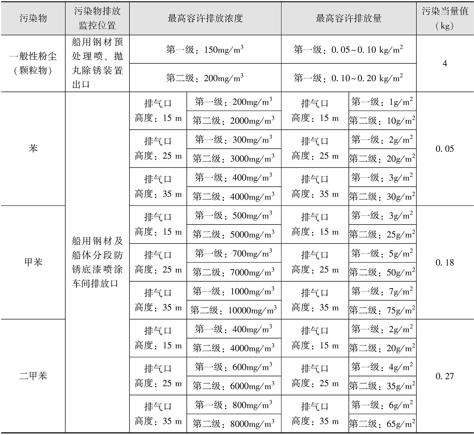 《船舶工业污染物排放标准》(GB 4286—84)规定了船舶工业企业及其生产设施排入大气中的4种污染物监测项目,即一般性粉尘(颗粒物)、苯、甲苯和二甲苯,均为《中华人民共和国环境保护税法》中规定的应税污染物,其应税污染物排放限值及污染当量值见表2-4。