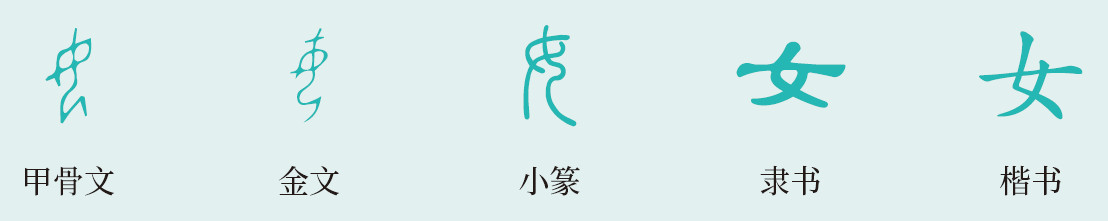 “女”的甲骨文像一个双手交叠温顺跪坐的女性形象,本义是未出嫁的女子。《诗经·周南·关雎》中的“窈窕淑女,君子好逑”,意思是美丽贤淑的女子,会是君子的好配偶,其中的“女”就是“闺中女子”的意思。现代汉语中“女”指所有的女性,与“男”相对,如“女生”指女同学,和“男生”相对。古代用“儿”表示孩子,后来专指“儿子”,女孩子用“女儿”或“女”表示,构词如儿女情长、生儿育女。