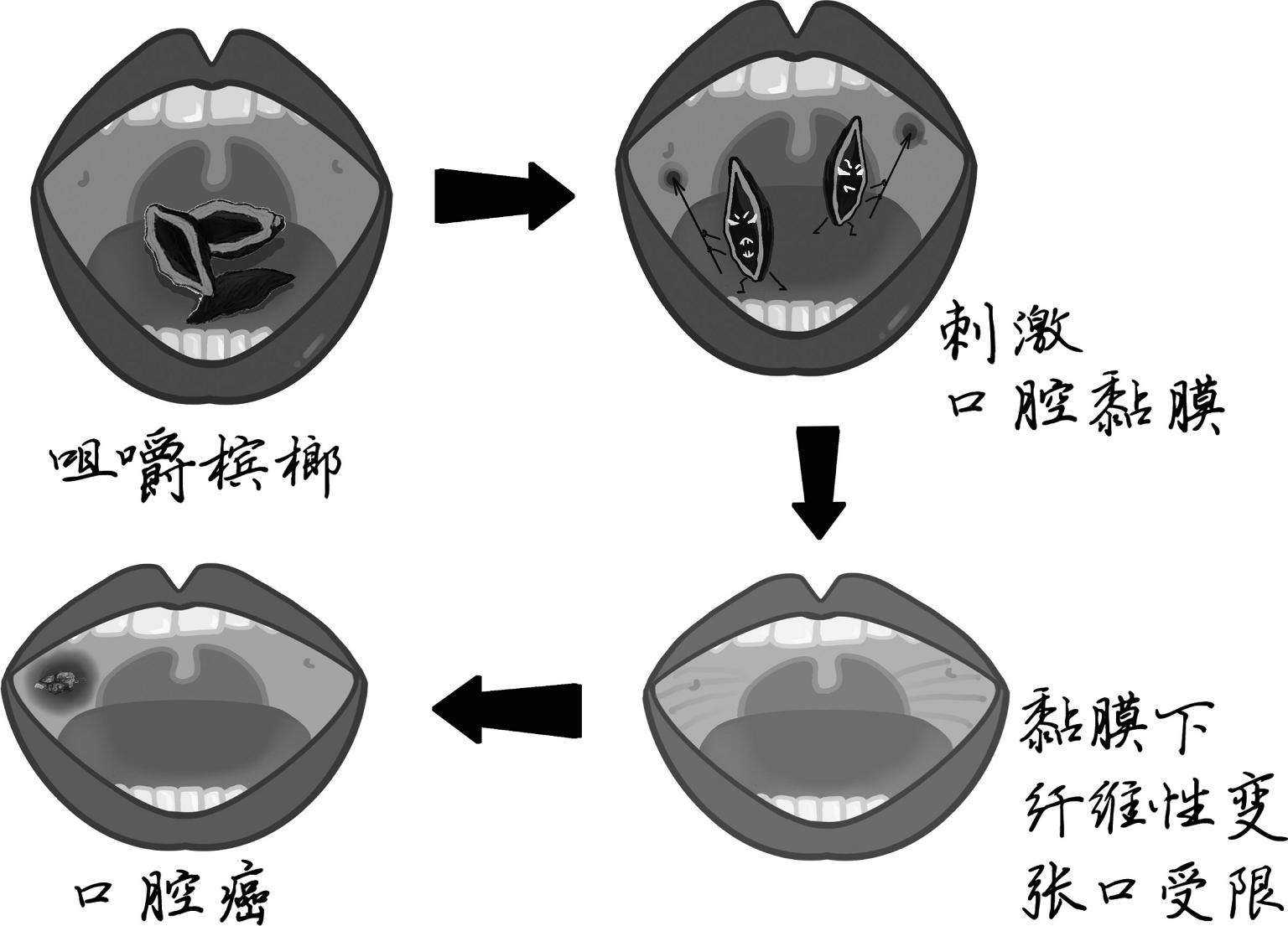(3)槟榔经过咀嚼之后,槟榔中的化学成分,如槟榔生物碱、多酚等化学物质,通过破损的口腔黏膜深入组织内部,再经过一系列通路,激活癌基因,最终演变为口腔癌。