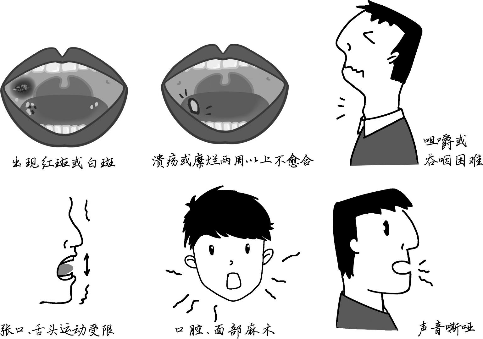 早期口腔癌的临床表现与一般的口腔黏膜病变类似,初起黏膜可有硬结,继而表面糜烂、溃疡,浅在而无坏死,表面呈鲜红色,中间有时会出现少量的散在白色斑点,自觉不适,偶有刺激性疼痛。此时,如果没有及时治疗,癌变会进一步发展,癌变部位出现明显的溃疡和炎症且长期不愈,溃疡周边和深面出现硬块,疼痛加重,影响进食和说话。口腔癌晚期,肿瘤侵犯颌骨会引起牙齿松动、脱落,侵犯与张闭口相关的肌肉时,会出现张口逐步受限。当癌细胞进展侵入附近的淋巴系统,患者还可能出现下颌下方、颈部淋巴结的肿大,一旦癌细胞进入血液循环定植于远处器官,如肺、骨等部位,还会出现呼吸困难、骨头疼痛等相应症状。由于口腔癌在早期就可能对患者的进食功能造成影响,常常会导致患者体重下降,后续肿瘤进一步发展,不断增殖的癌细胞也会在病程中不断地对人体产生消耗,导致患者出现消瘦、贫血、机体功能衰竭。