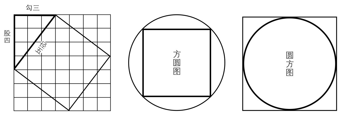 这是方圆之法。 这是通过方形求得圆形的方法。 周围的万事万物都要用到圆形和方形,大工匠为制作物品而设计了规和矩。由方形求得圆形,或需打破正方形变为多边形,以此不断地趋近圆形,或切割圆弧为多段作为多边形的近似边。由内接正方形向外推算圆的示意图称为方圆图,由外切正方形向内推算圆的示意图称为圆方图。