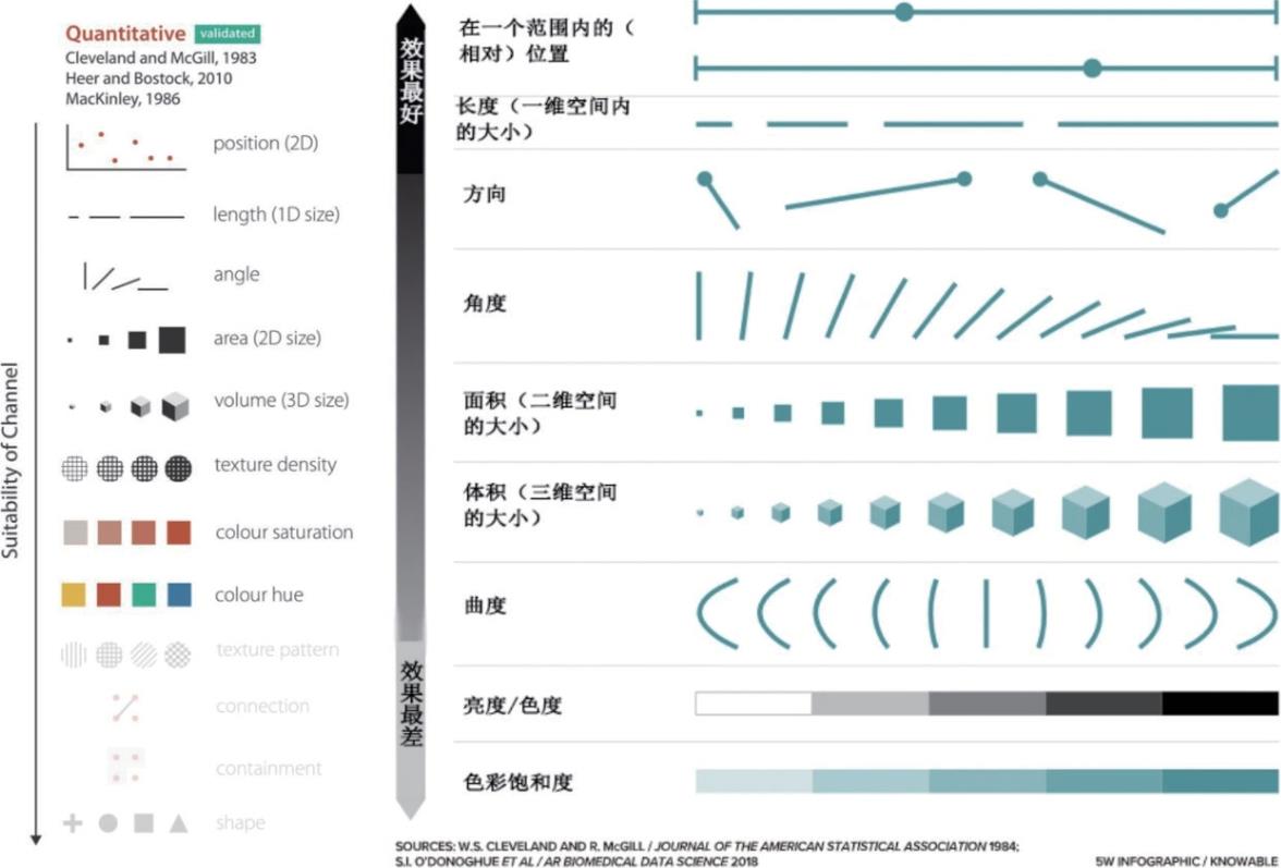 根据前面的内容,我们了解到,构成可视化作品核心部分的底层逻辑主要是五个不同维度的视觉暗示,每一类视觉暗示都很重要,并且是大部分可视化作品中的重要因素。这时你可能会问:“到底哪类视觉暗示最好用、最万能呢?”