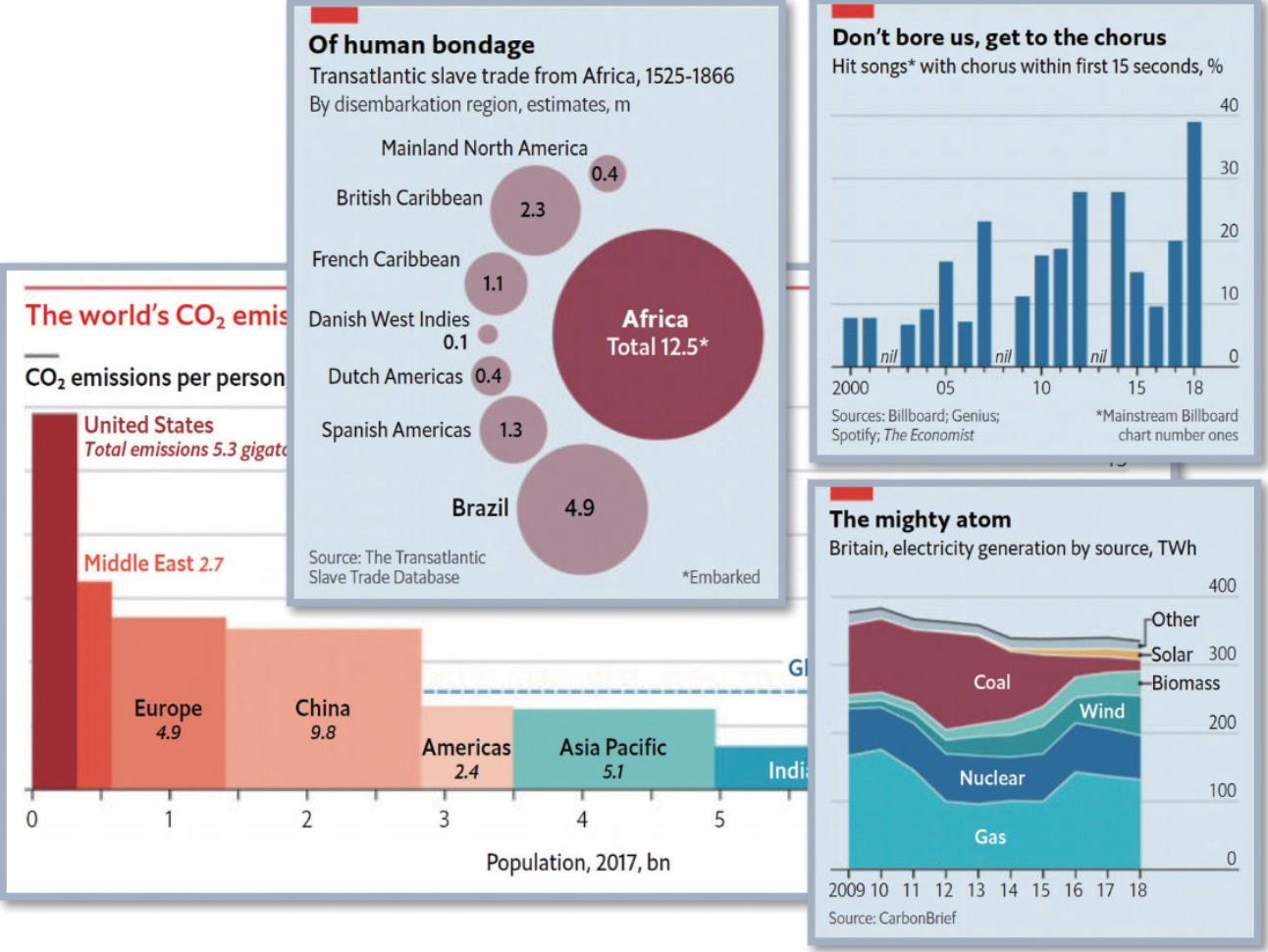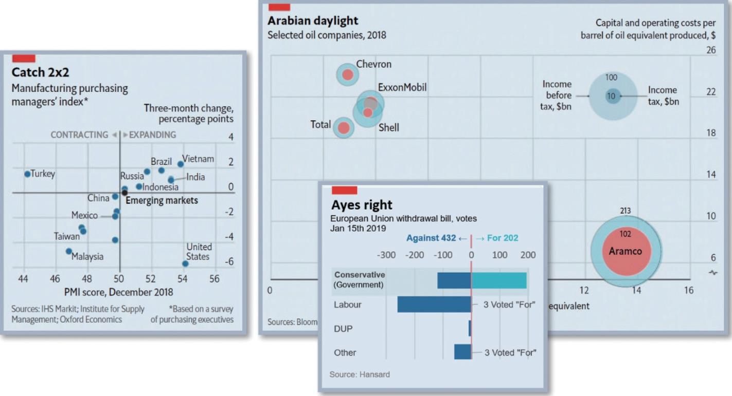 第三类视觉暗示包括长度视觉暗示、面积视觉暗示和体积视觉暗示,因为它们本质上反映的都是大小问题(分别表示一维空间、二维空间和三维空间的大小差异),所以统一进行说明。同样,在长度、面积和体积的差异识别上,读者不需要花费多少精力就可以完成。长度视觉暗示、面积视觉暗示和体积视觉暗示的应用范例如图2-11所示(图表来自《经济学人》)。