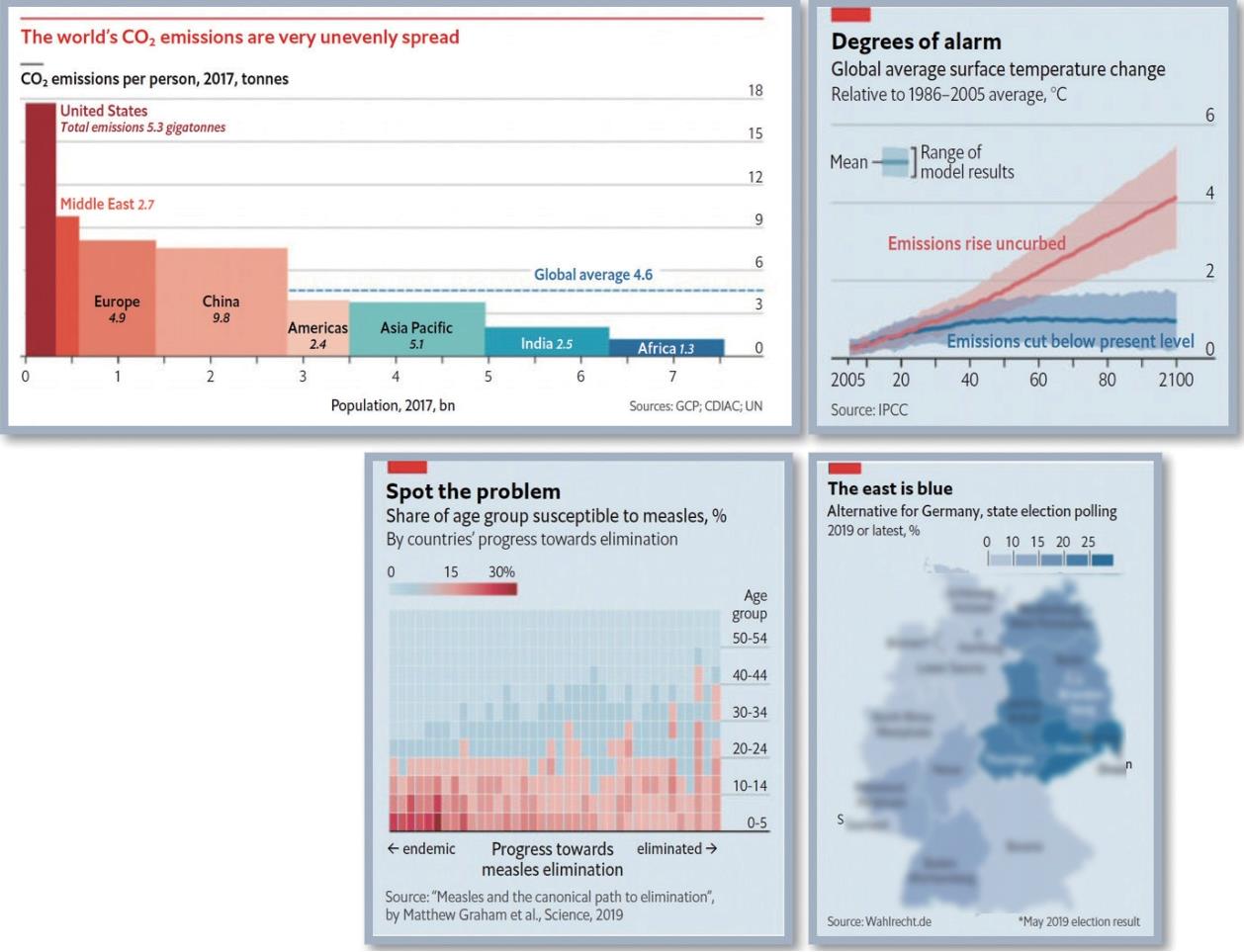 第五类视觉暗示包括与颜色有关的色相视觉暗示和饱和度视觉暗示,可以将二者笼统地看作颜色视觉暗示。与前面的位置视觉暗示、形状视觉暗示、长度视觉暗示、面积视觉暗示、体积视觉暗示、角度视觉暗示、方向视觉暗示不同,颜色视觉暗示为我们提供了一个全新的用于呈现数据的维度,也是大部分图表制作、可视化作品制作过程中不可或缺的视觉暗示。即使在黑白印刷的作品中,也可以使用颜色的灰度作为视觉暗示构建图表。色相视觉暗示和饱和度视觉暗示的应用范例如图2-14所示(图表来自《经济学人》)。