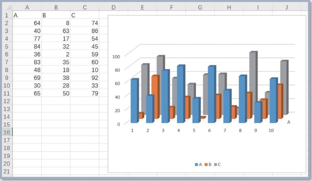 使用随机数据创建的具有三个数据系列的三维柱形图如图2-12所示。在图2-12中,因为采用三维呈现方法,所以层叠关系在平面上的观感较为混乱;因为三维图形涉及前后关系,所以在数据的读数和对比上存在较大难度。
