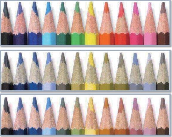 图2-15 普通视觉(上)与红色盲(中)、绿色盲(下)的颜色对比