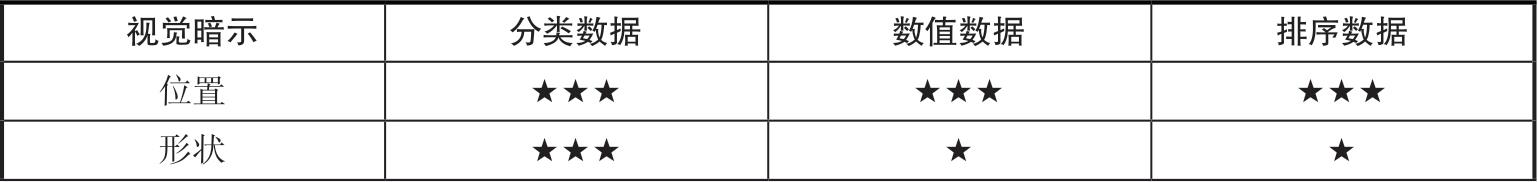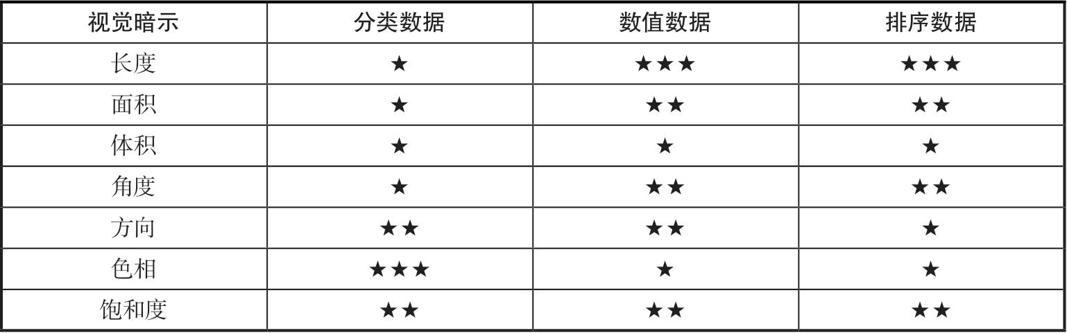 表2-1 不同的视觉暗示适合呈现的数据类型