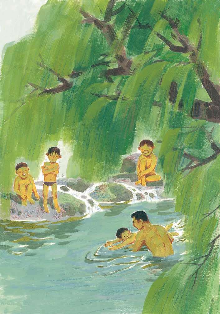 我捏着鼻子张大嘴,猛吸几口气憋住。我要试试,一口气到底能游多远。我扑下去。太阳照下来,水闪着翠绿的光在眼前波动。圆圆的卵石散布河底,看上去像大大小小的鸡蛋鹅蛋。几条小鱼在前面游,胳膊划过去,小鱼嗖的一下蹿没了。