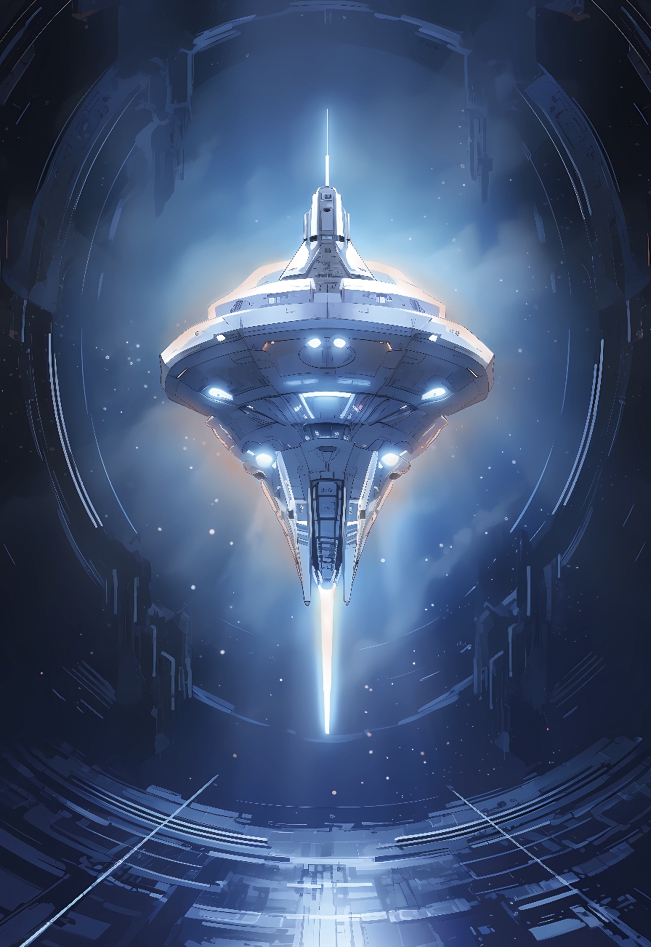 那艘巨大的宇宙飞船在灯塔的探照灯的照射下,逐渐占据了整个画面。飞船的船体闪烁着银光……
