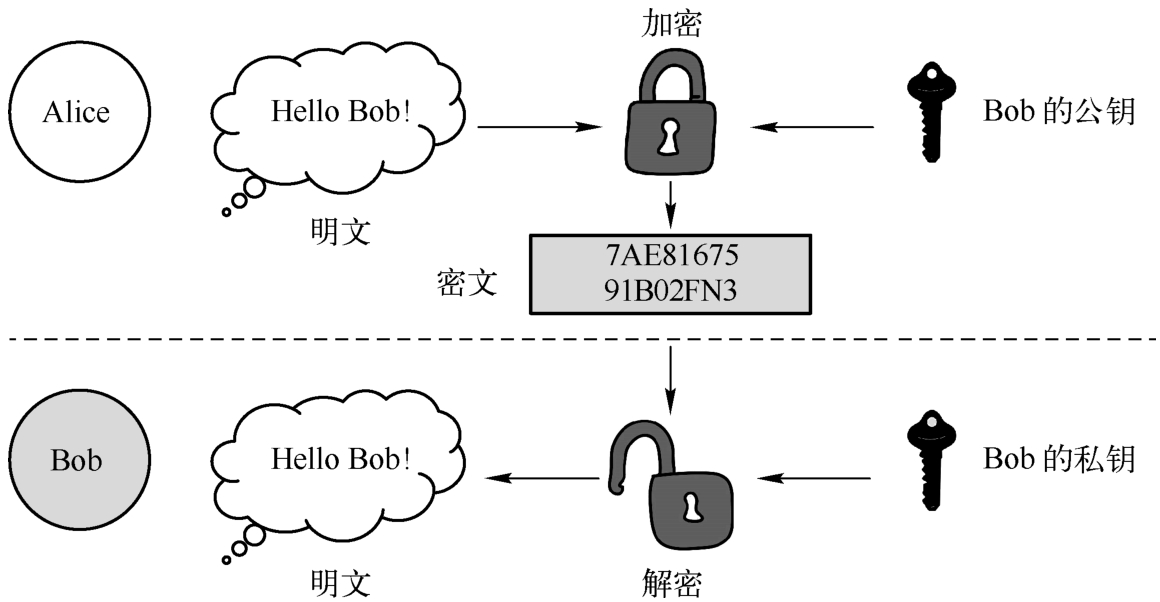 密码技术包括密码编码技术和密码分析技术。密码体制的设计是密码编码技术的核心。密码体制的破译是密码分析技术的主要内容。两者相互依存、共同发展、密不可分。现代密码学主要存在对称密码体制(Symmetric Cryptosystem)和非对称密码体制(Asymmetric Cryptosystem)两大密码体制。如图1-1所示,对称密码体制的主要特点是在对明文(Plaintext)进行加密和对密文(Ciphertext)进行解密时,通信双方使用同一个密钥或两个可以进行相互推算的密钥。目前广泛使用的对称加密算法有DES(Data Encryption Standard) [6] 、3DES和AES(Advanced Encryption Standard) [7] 等。对称密码体制最大的优点是计算量小、加解密运算效率高。由于通信双方总是需要使用相同的密钥,因此密钥的分发和管理相对困难,安全性得不到保障。1976年,Diffie和Hellman在 New Directions in Cryptography 一文 [8] 中首次提出了使用公开密钥进行加密的方法,使得双方可以在不事先共享任何秘密信息的前提下安全地进行通信,开辟了非对称密码体制这一全新的研究领域。非对称密码体制又称公钥密码体制(Public-Key Cryptosystem),如图1-2所示,主要特点是需要使用两个不同的密钥分别进行加密和解密。用于加密的密钥可以公开,被称为公钥(Public Key)。用于解密的密钥仅被解密方私有,被称为私钥(Private Key)。虽然公钥和私钥具有一定的数学相关性,但是无法通过公钥计算推断出私钥。目前广泛使用的公钥加密算法有RSA(Rivest Shamir Adleman) [9] 、椭圆曲线密码(Elliptic Curve Cryptography,ECC) [10-11] 、ElGamal [12] 和背包密码 [13] 等。与对称密码体制相比,公钥密码体制只需要公开发送公钥而单方保管私钥,仍然适合在不安全的通信环境中使用,计算更为复杂,加解密运算效率低于对称密码体制。