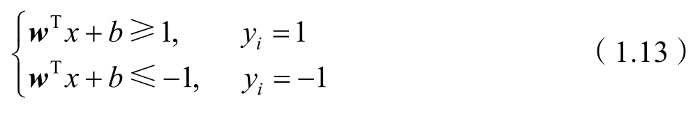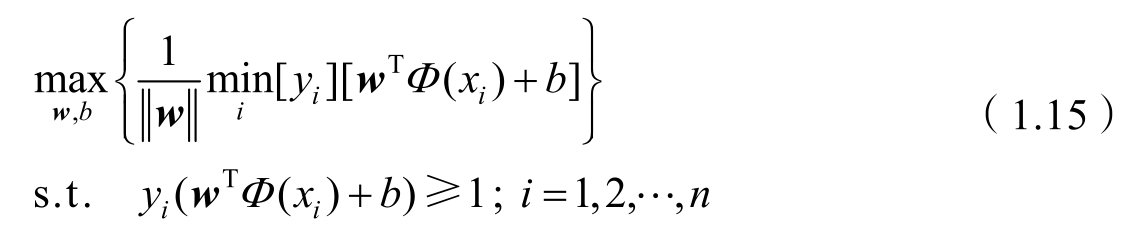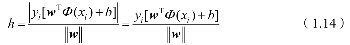 假设未知的符合要求的超平面为 f ( x )= w T Φ ( x )+ b 。当 x 为正例时, y =1;当 x 为负例时, y =-1。也就是说,当且仅当 f ( x )>0时, y i =1;当且仅当 f ( x )<0时, y i =-1。由此可得, y i ⋅f ( x )>0。由式(1.12)可得