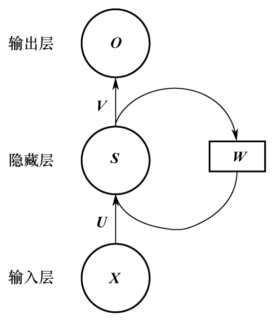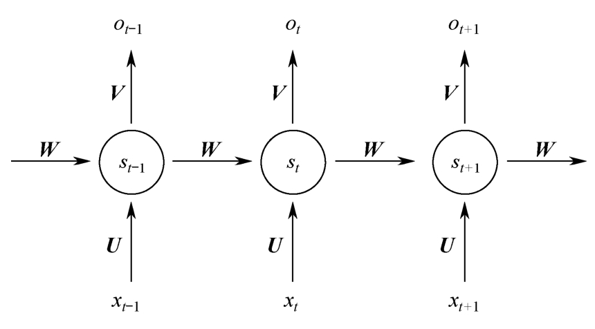 不同于典型的全连接神经网络,RNN的隐藏层内有一种循环结构。如图1.9所示, X 是一个输入向量; S 是隐藏层向量; U 是从输入层到隐藏层的权重矩阵; O 是输出层向量; V 是从隐藏层到输出层的权重矩阵。另外, S 取决于当前的输入向量 X 和上一隐藏层的 s t -1 ; W 是上一隐藏层的值在本层的权重。RNN按时间展开如图1.10所示。