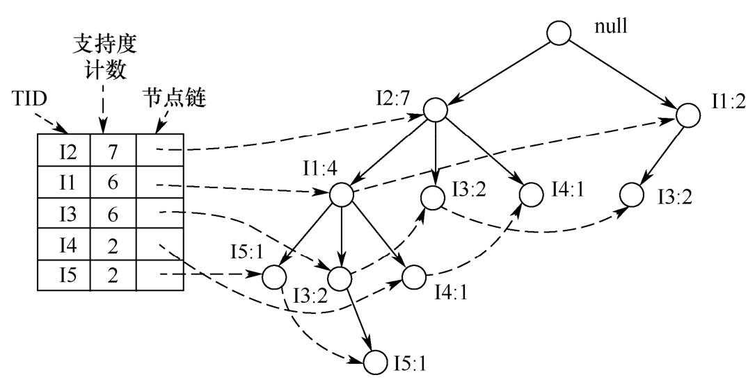 FP-Tree:把事务数据库中的各个事务数据项按照支持度排序后,把每个事务中的数据项降序插入到一棵以null为根节点的树中,同时在每个节点处记录该节点出现的支持度。