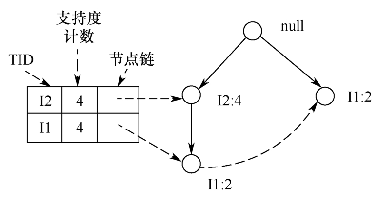 FP-Tree算法的基本工作原理:首先,扫描整个事务数据库一次,生成频繁项集,并把它们按降序排列,排除支持度计数小于min_sup的项,产生结果集 L ;其次,按照项集描绘出FP-Tree,同时保留关联信息;最后,再扫描事务数据库一次,由下向上顺序挖掘,删除FP-Tree中的子节点,即可产生所需要的频繁模式。FP-Tree算法的基本数据结构,包含一个FP-Tree和一个项头表,每一项通过一个节点链指向它在树中出现的位置。FP-Tree算法基本结构如图1.17所示。