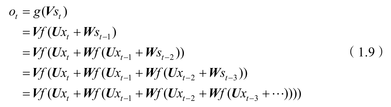从图1.10中可知,在 t 时刻,神经元在接收输入向量 X 的同时还会受上一时刻 s t -1 的影响,最终得到隐藏层的值 s t ;然后得到输出层的值 o t 。输出层的所有神经元都与上一隐藏层的所有神经元相连,输出层的值为