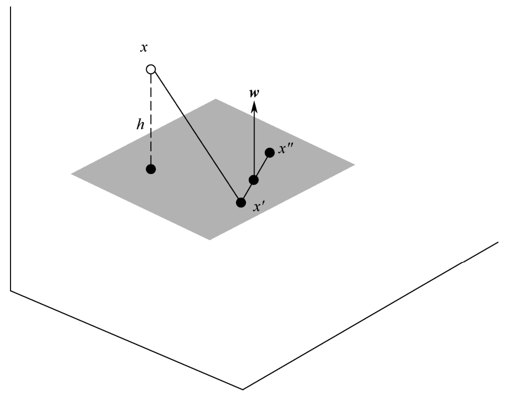 x 是超平面外的一个样本点, x' 和 x'' 是超平面上的两个点, w 是超平面的一个法向量,需要算出点 x 到超平面的距离,则